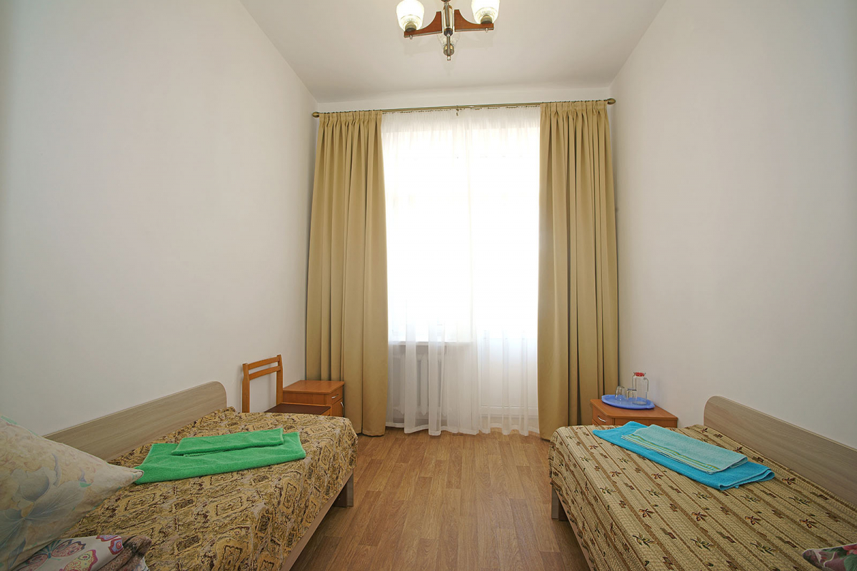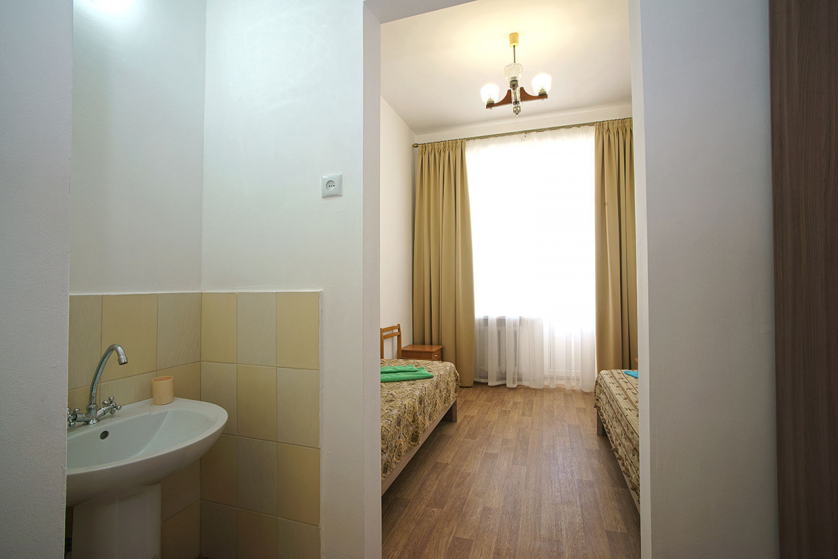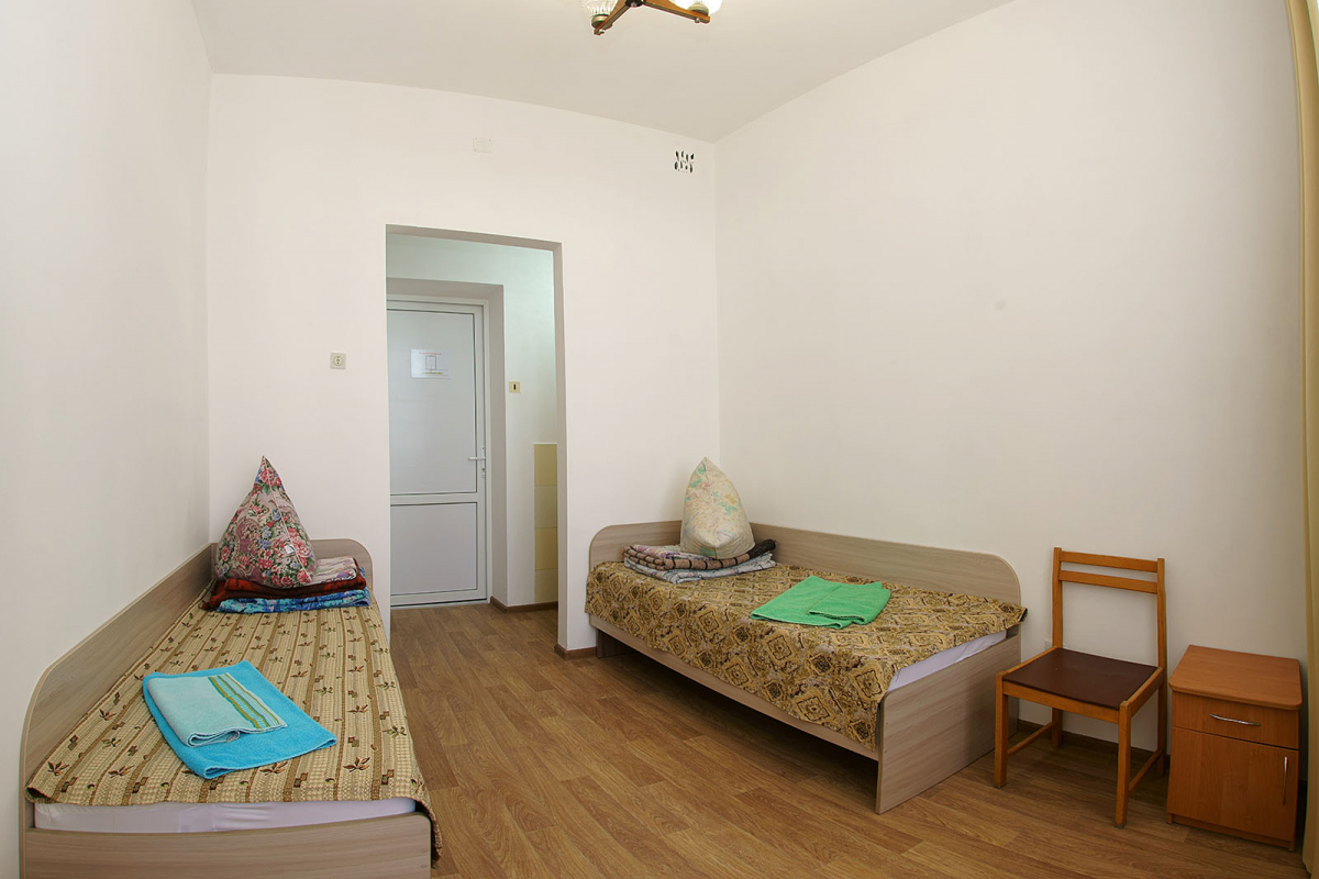 Площадь номера - 12 кв.м. 2 осн. места. Балкон. Мебель: вешалка, зеркало, кровати односпальные (2 шт.), прикроватная тумбочка, стул, шкаф. Оборудование: телевизор (на этаже), холодильник (на этаже). Санузел. Санузел и душевые на этаже. Сервис: смена полотенец, смена постельного белья, уборка номера.