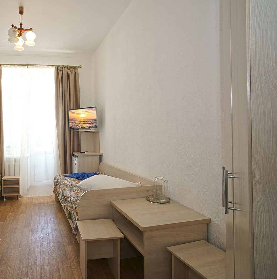 Площадь номера - 9 кв.м. 1 осн. место. Балкон. Мебель: вешалка, зеркало, кровать односпальная, прикроватная тумбочка, стул, шкаф. Оборудование: кондиционер, телевизор, холодильник. Санузел: с душем, туалетные принадлежности. Сервис: смена полотенец, смена постельного белья, уборка номера.